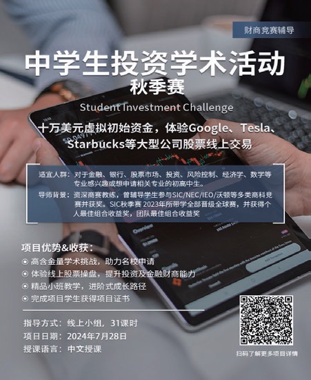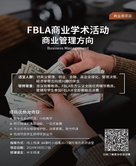● WGHS:沃顿商业投资挑战赛 ● FBLA/BPA:全球未来商业领袖挑战/商业全能挑战 ● NEC:全美经济学挑战赛 ● SIC:中学生投资挑战赛 ● BPC:青年商业案例分析论坛