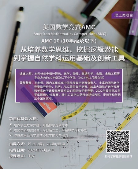● HIMCM:国际高中生数学建模竞赛 ● MCM/ICM:大学生数学建模竞 ● Math Kangaroo:袋鼠数学竞 ● Euclid Mathematics Contest:欧几里得数学竞赛 ● Physics Bowl:物理碗 ● CCC:加拿大化学思维挑战活动 ● BBO:英国中学生物奥林匹克 ● HOSA:生物与健康未来领袖挑战 ● AMC:美国数学竞赛